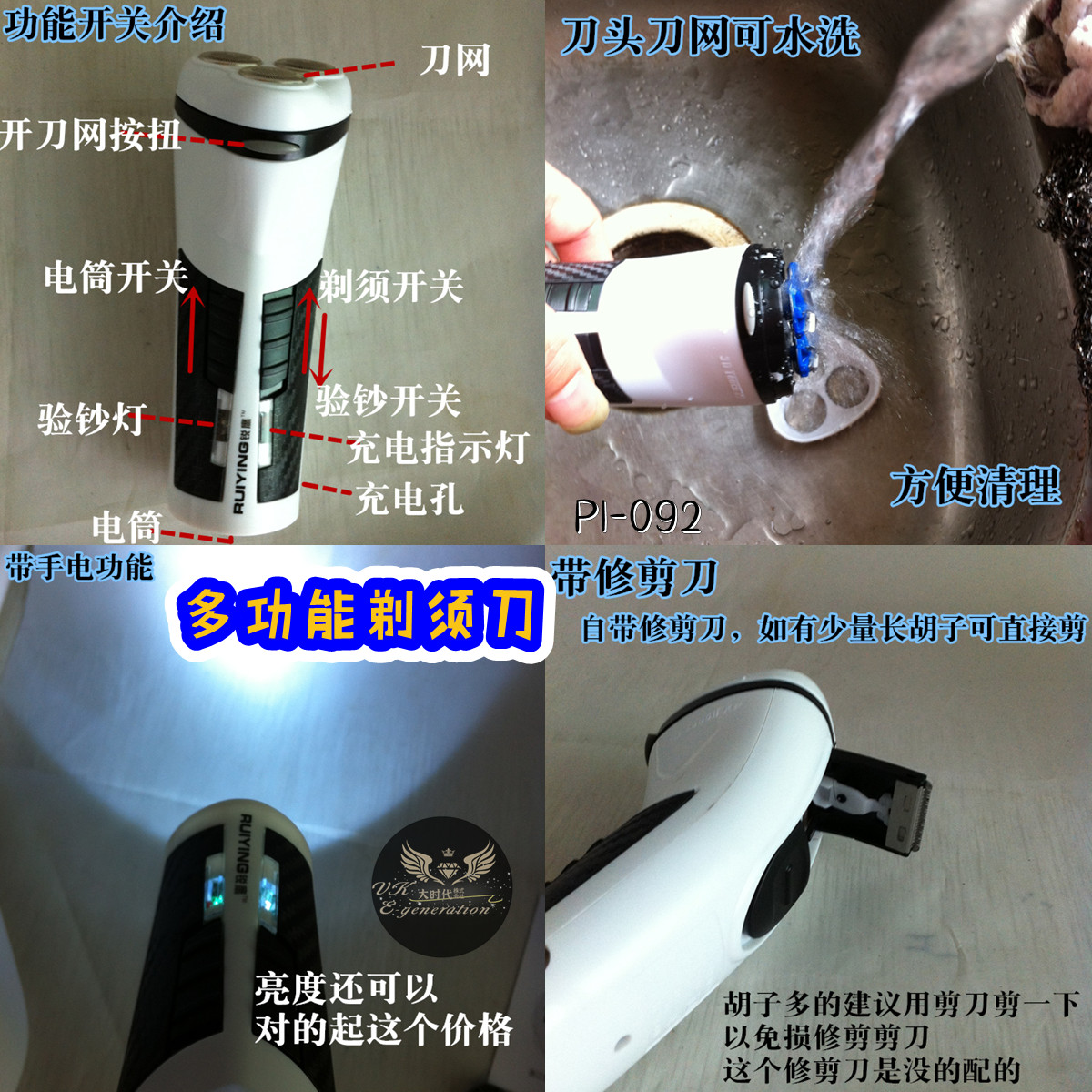 锐鹰多功能剃须刀,为三刀头旋转,浮动刀网设计,外形简单而实用。背部升级附带推剪,方便剃长胡子。尾部附带高亮度LED手电筒,晚上出门方便携带。把手内置验钞功能,真正做到了一机多用,全部功能都是实用性非常强!