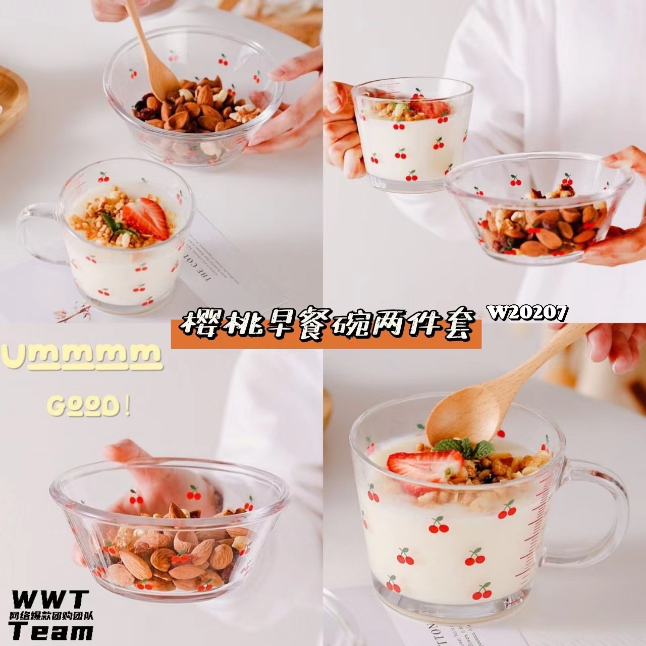 🍵早餐碗和早餐杯都是玻璃材质,耐热耐冷✅安全无毒又耐用✅,只要不打破就能用一辈子~🤣樱桃大口杯上还有刻度,可以精准泡出你要的分量,同时也能当作量杯使用呢❗