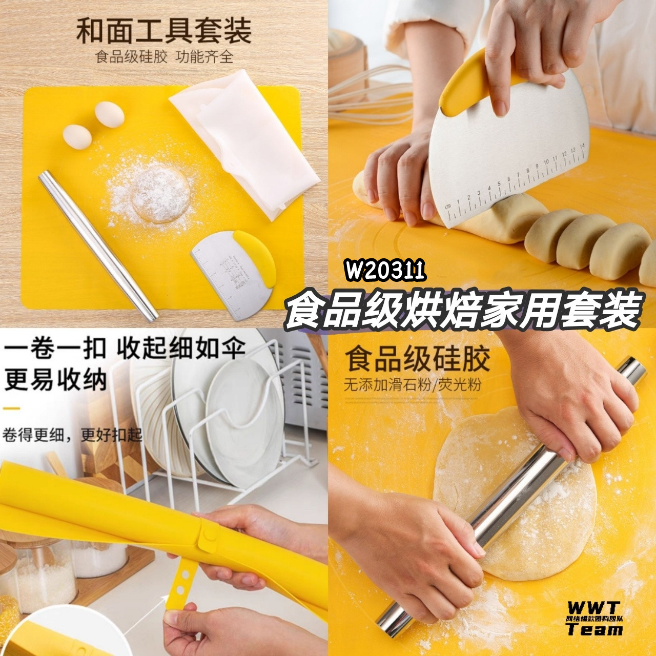 无聊在家就是要搞烘培呀✌,食品级加厚硅胶材质,非常安全,一个套装买回去,功能齐全,不锈钢切面刀〰️切面不粘,不滑手,揉面垫非常方便收纳,一卷一扣收纳起来细如伞🤣🤣,擀面杖也是不锈钢的👍
