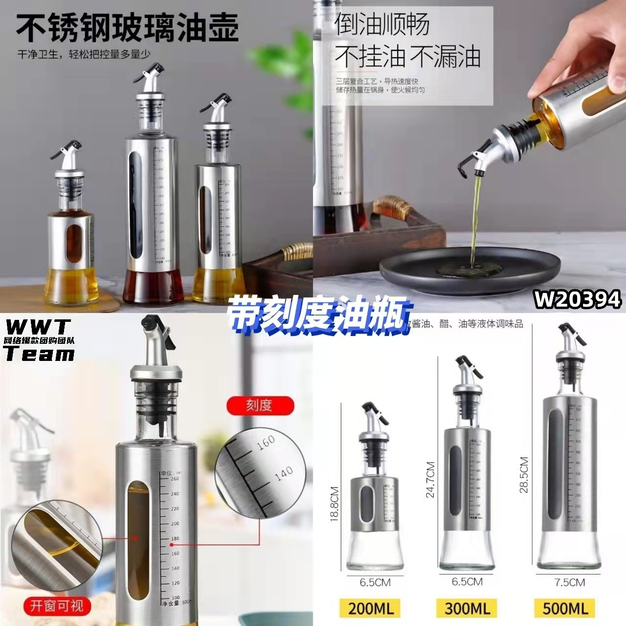 带刻度的油瓶比一般的更能准确倒出要用的份量‼️‼️,让你每一次料理都不失手。玻璃瓶身能一眼看出用量剩多少,开口的防漏嘴设计单手就能操作,超方便👏🏻