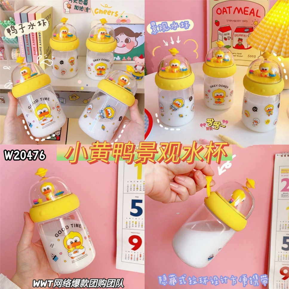 新款小黄鸭水杯🔥🔥🔥,硅胶公仔杯盖,圆润宽杯口,内置密封圈,防漏👍,隐形式提绳,不影响美观😘,手感舒适,非常可爱😍
