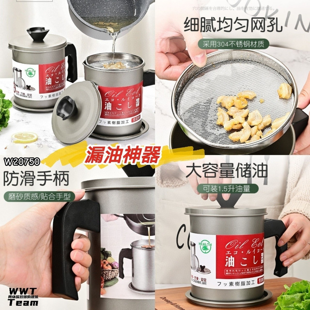 底部有防滑防烫底座,不会烫伤桌面,304不锈钢过滤网片,滤孔特别均匀,过滤油渣更干净,滤渣✅、储油✅一步到位,轻松过滤炸完食品的