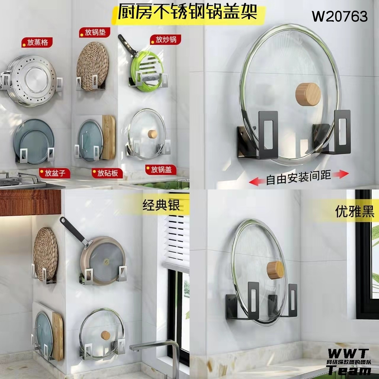 新款不锈钢锅盖架‼️,一对两片锅盖架,多种用途,免打孔款✅,这个工厂质量非常好👍🏻 两片锅盖架之间宽度可以自己调整才黏上哦💖~架子的内宽度是5.5cm↔️,锅盖、平底锅、栈板甚至蒸锅都可以挂👍🏻